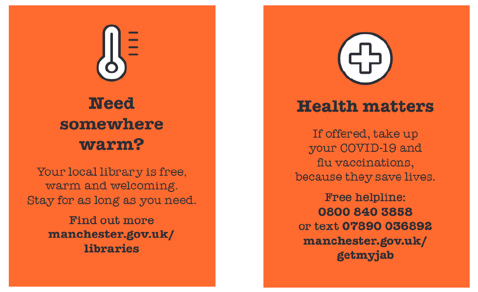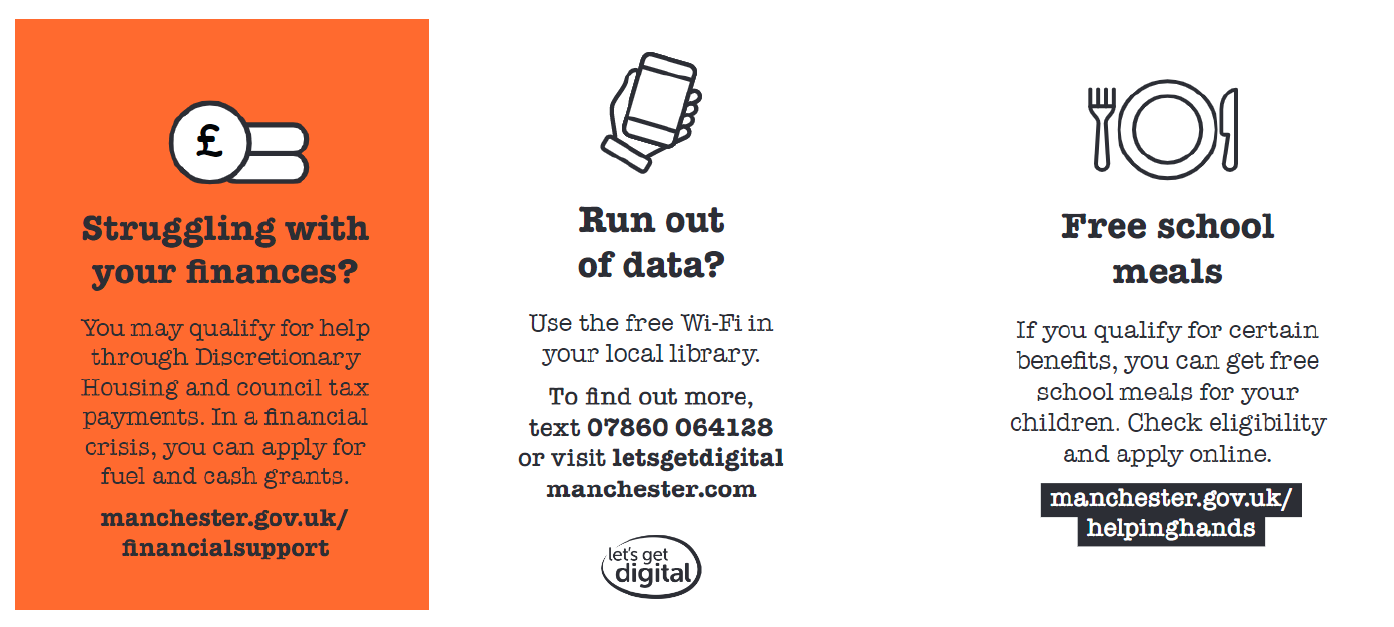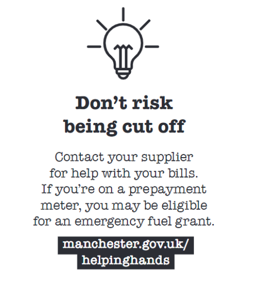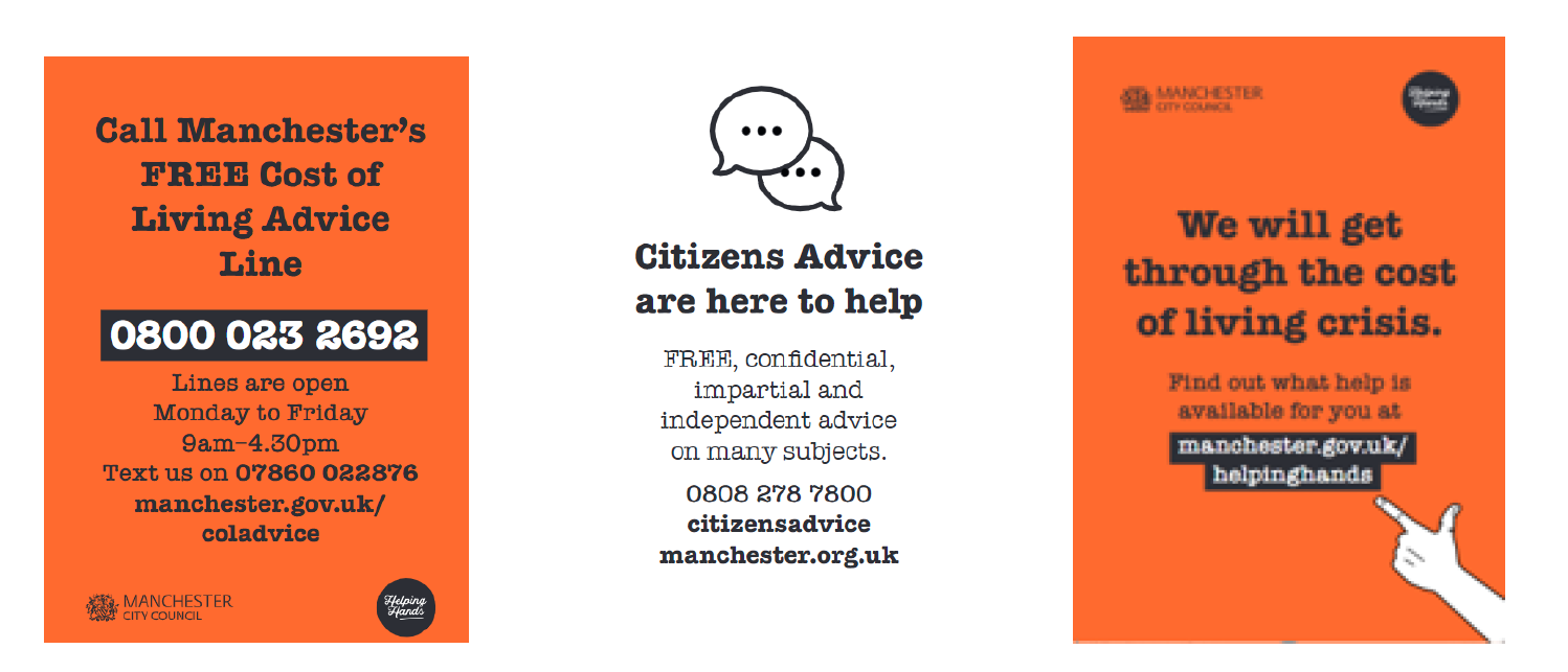 Manchester FREE Cost of Living Advice Line: Support with benefits, help and advice about rent, debt, bills, food support and help to get online (support to access the internet, laptops, phones and data). The advice line is open Monday to Friday 9am - 4:30pm on 0800 023 2692. You can also text 07860 022876 or visit manchester.gov.uk/coladvice